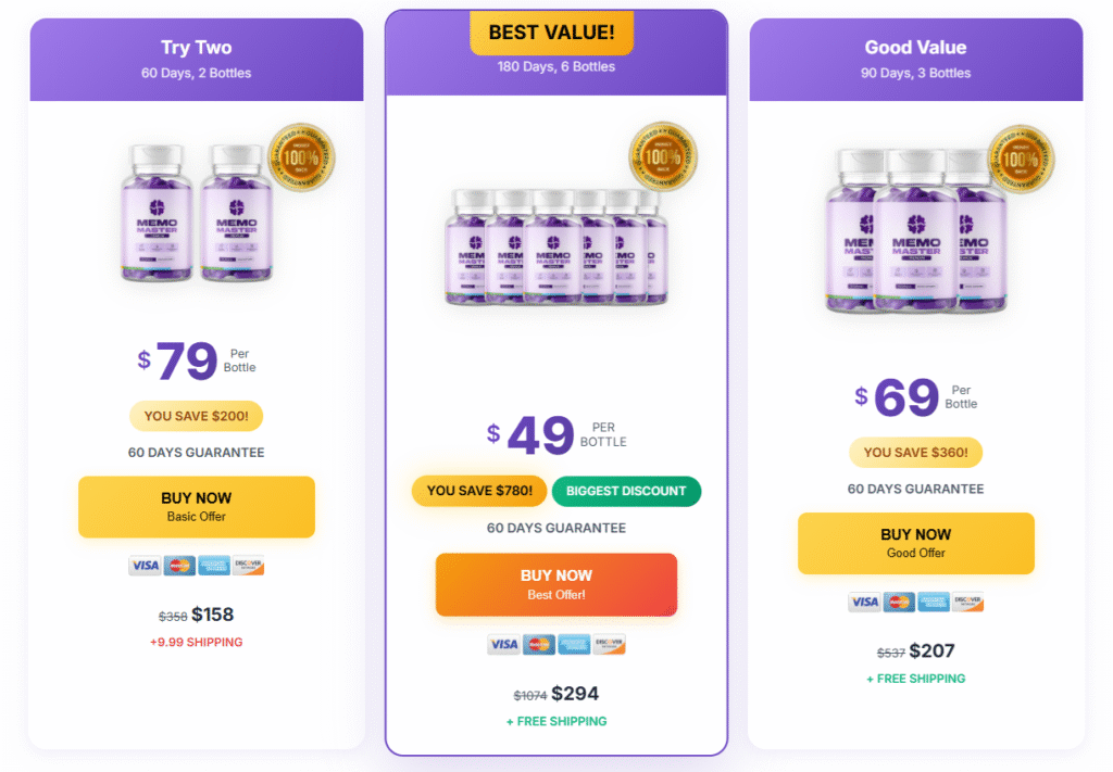 Right now, readers of this page have access to an exclusive discount of up to 73% OFF on the 6-bottle package, plus the company’s ironclad 60-day money-back guarantee. This means you can try MemoMaster completely risk-free: if for any reason you’re not satisfied, you get every penny back — no questions asked.